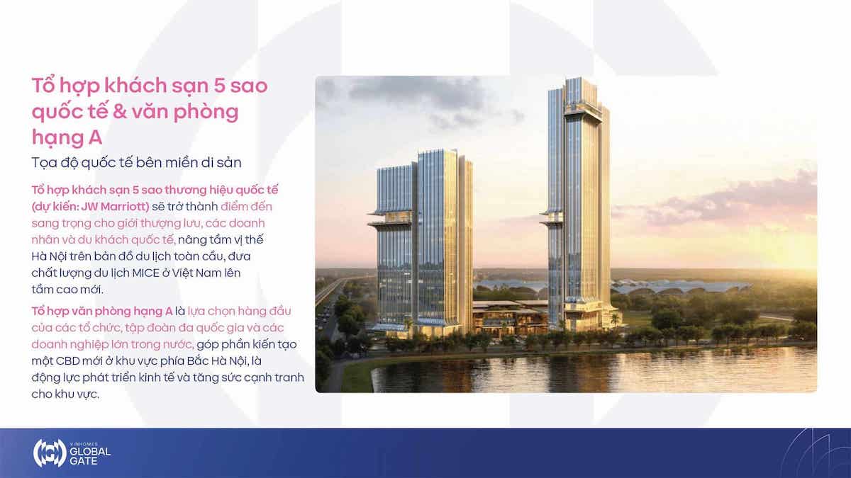 Vinhomes Global Gate sở hữu tổ hợp khách sạn 5 sao với kiến trúc sang trọng, được dự kiến vận hành bởi tập đoàn quản lý khách sạn hàng đầu thế giới – Marriott. Đây sẽ là điểm đến lưu trú lý tưởng dành cho du khách quốc tế và giới doanh nhân cao cấp.
