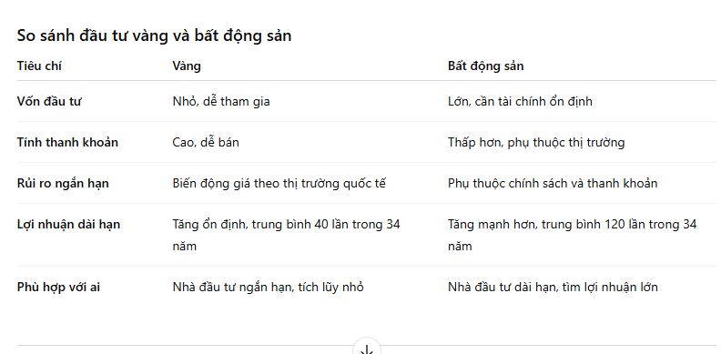 Nếu bạn là nhà đầu tư ngắn hạn, muốn bảo toàn vốn và có tính thanh khoản cao, vàng là lựa chọn phù hợp. Nếu bạn đầu tư dài hạn, có tầm nhìn 2–5 năm, bất động sản vẫn là kênh mang lại giá trị bền vững và lợi nhuận cao hơn.