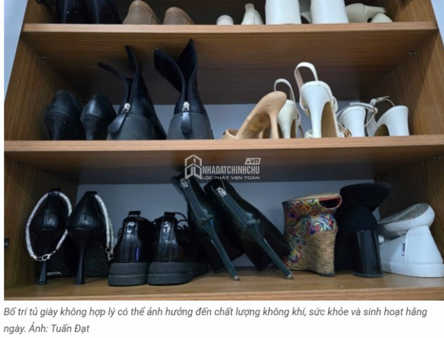 Việc đặt tủ giày ở phòng khách hoặc khu sinh hoạt chung, đặc biệt là loại tủ mở, có thể khiến mùi và vi khuẩn lan rộng. Ngoài ra, tủ giày quá cao hoặc khó vệ sinh sẽ làm bụi tích tụ lâu ngày, gây mất vệ sinh.