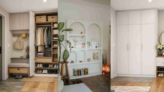Ngay từ khu vực lối vào, việc sắp xếp hợp lý sẽ giúp căn nhà luôn gọn gàng ngay từ cái nhìn đầu tiên. Một không gian sáng sủa, ngăn nắp khi vừa mở cửa không chỉ tạo cảm giác dễ chịu mà còn giúp giảm bớt sự bừa bộn. Giải pháp tủ lưu trữ tích hợp hoặc tủ âm tường được xem là lựa chọn phù hợp, bởi vừa tiết kiệm diện tích vừa mang lại vẻ hiện đại. Bên trong tủ có thể bố trí linh hoạt các ngăn, kệ và thanh treo để phân loại đồ dùng như giày dép, áo khoác hay phụ kiện một cách khoa học.