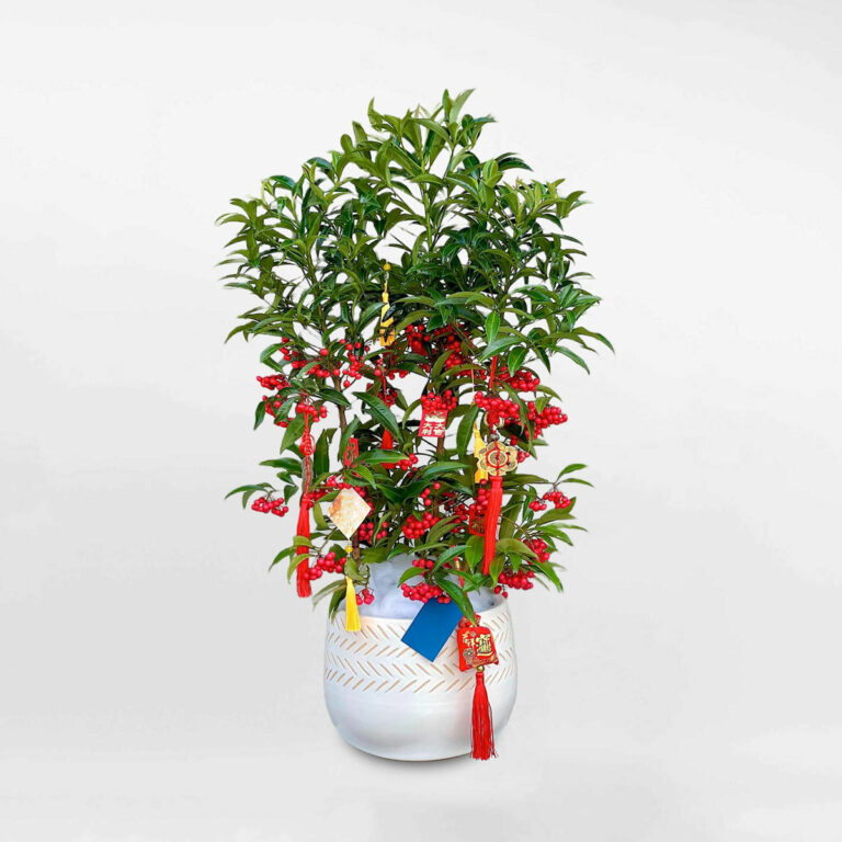 Kim ngân lượng được ưa chuộng nhờ chùm quả đỏ mọng tượng trưng cho tài lộc và thịnh vượng. Quả mọc dày dưới tán lá xanh tạo mảng màu nổi bật, thích hợp bố trí tại phòng khách hoặc lối vào nhà. Cây ưa sáng nhẹ và môi trường mát; cần tưới nước đều, duy trì độ ẩm ổn định để quả bền màu, hạn chế rụng sớm.