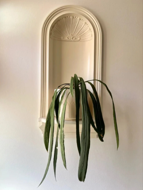 Chậu cây Anthurium vittarifolium được đặt trong hốc tường của hành lang thông tầng, giúp tạo điểm nhấn thị giác. Ảnh: Happyhouseplants
