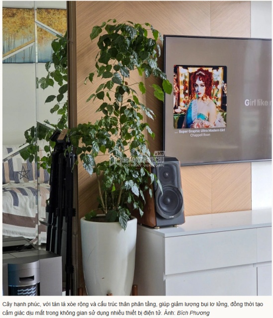 Một số loại cây có tán rộng như cây hạnh phúc cũng có thể đặt tại khu vực sinh hoạt chung để giảm lượng bụi lơ lửng và tạo cảm giác dễ chịu cho không gian. Những mảng xanh nhỏ này giúp cân bằng môi trường trong nhà, đặc biệt khi không gian sử dụng nhiều thiết bị điện tử.