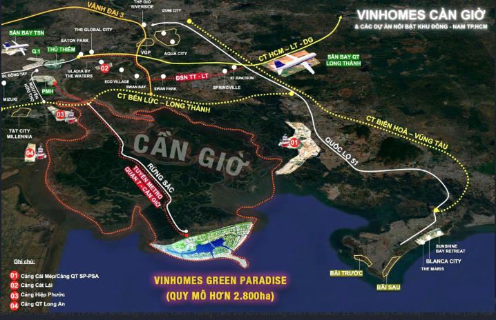 Vinhomes Cần Giờ nằm cách trung tâm TP.HCM khoảng 50 km, cách Vũng Tàu 20 km đường biển và cách 12 km Cảng Cái Mép – Thị Vải (Bà Rịa – Vũng Tàu cũ) 12 km. Đây là yếu tố chiến lược giúp Cần Giờ trở thành cực tăng trưởng mới của khu vực Đông Nam Bộ.