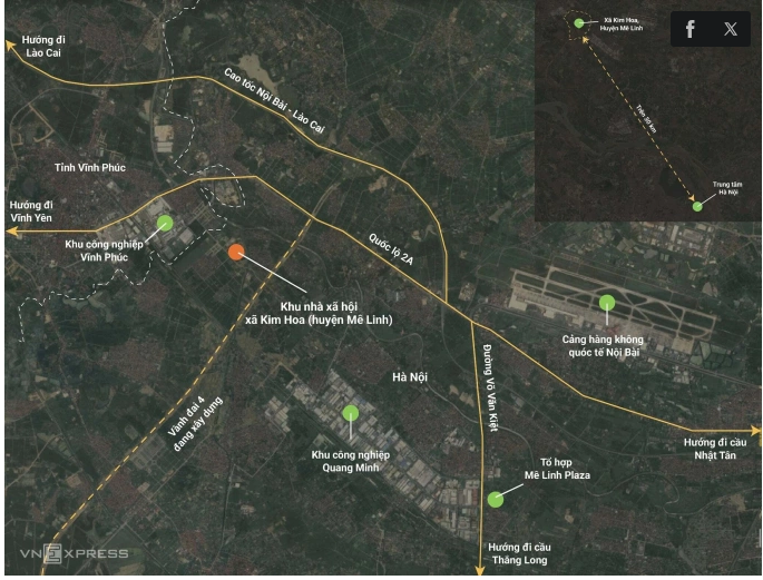 Vị trí dự án nhà ở xã hội tại xã Kim Hoa, huyện Mê Linh vừa mở bán. Đồ họa: Anh Tú