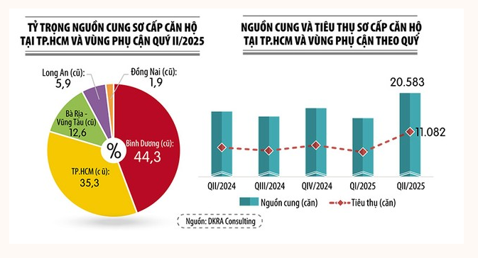 - Theo DKRA, quý II/2025 ghi nhận khoảng 20.580 căn hộ mở bán tại TP.HCM và vùng phụ cận, trong đó tiêu thụ 11.000 căn, đạt tỷ lệ hấp thụ 54%, gần gấp đôi quý trước và cùng kỳ 2024.